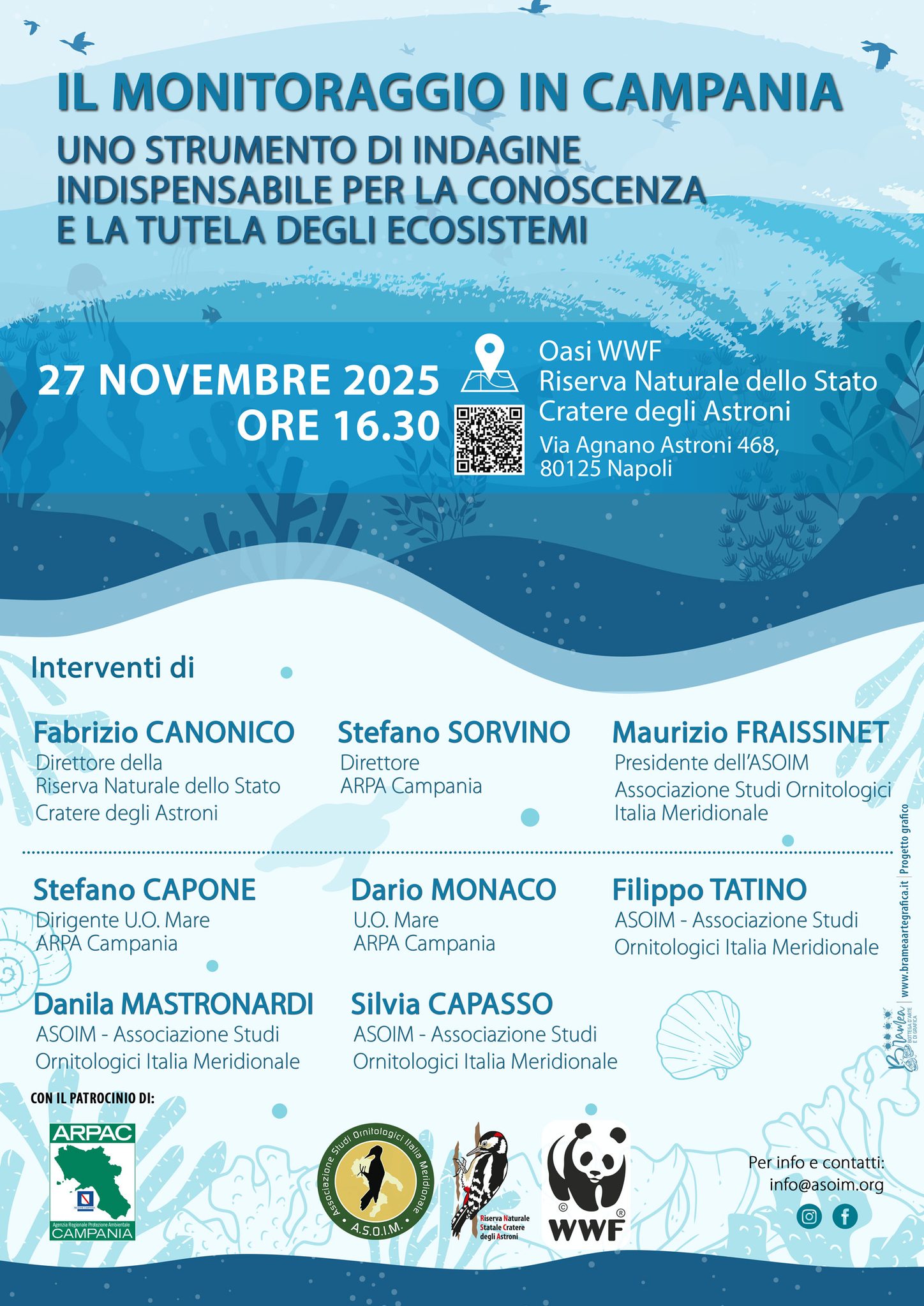 Giovedì 27 novembre, presso l’Oasi Cratere degli Astroni (NA), si terrà il convegno “Il monitoraggio in Campania, uno strumento di indagine indispensabile per la conoscenza e la tutela degli ecosistemi”, organizzato da ASOIM (Associazione Studi Ornitologici Italia Meridionale) in collaborazione con ARPA Campania e WWF.