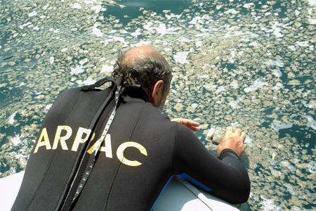 Nel mese di giugno appena trascorso sono pervenute da più parti numerose segnalazioni di schiume o chiazze di colore brunastro maleodoranti e di scie che si presentano lungo la costa, in particolare modo tra la tarda mattinata e le prime ore del pomeriggio. In relazione a tale problematica, durante le attività in mare di questo mese, l’Arpa Campania in più occasioni ha effettuato campionamenti aggiuntivi con indagini analitiche che hanno riguardato, oltre ai normali parametri microbiologici, anche la determinazione di parametri chimici, di nutrienti e fitoplancton.