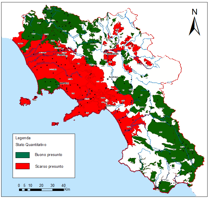 La classificazione quantitativa in Campania non è stata ancora pienamente definita con dati aggiornati. La Relazione del Piano di Gestione delle Acque – III Ciclo 2021–2027 (Distretto Appennino Meridionale) conferma provvisoriamente lo stato quantitativo delle acque sotterranee della Campania già indicato nel precedente ciclo di piano. In altri termini, lo stato quantitativo, già valutato come “presunto” nel Piano precedente (basato su dati 2014–2015 e su giudizio esperto), resta invariato. Gran parte dei corpi idrici sotterranei campani sono considerati in stato quantitativo “buono” (presunto buono in assenza di forti evidenze di over-exploitation), mentre solo alcuni acquiferi critici sono indicati a rischio di stato “scarso”.