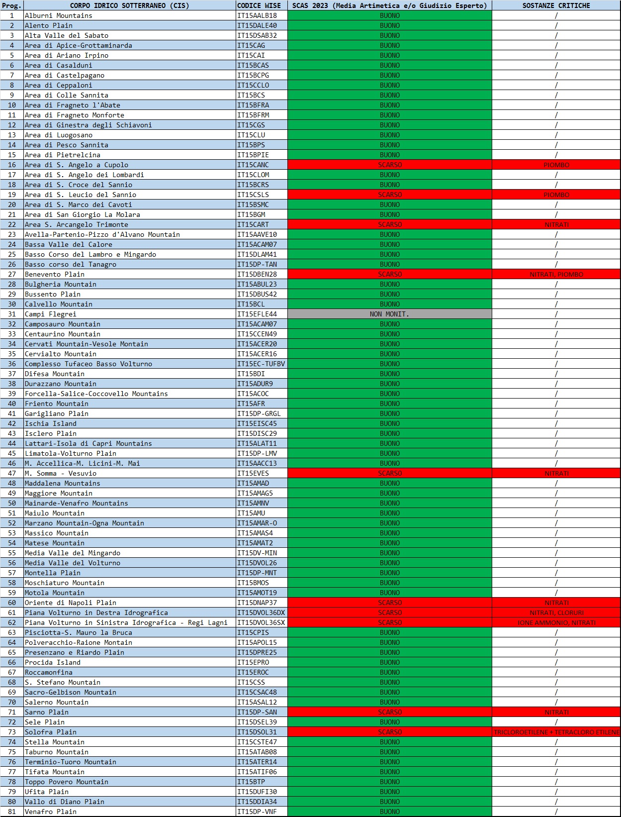 Di seguito sono riportale le mappe esplicative e le tabelle sintetiche degli esiti dello Stato Chimico annuale per ciascun corpo idrico sotterraneo della Campania relative all’attuale sessennio di riferimento per il monitoraggio 2021 - 2026