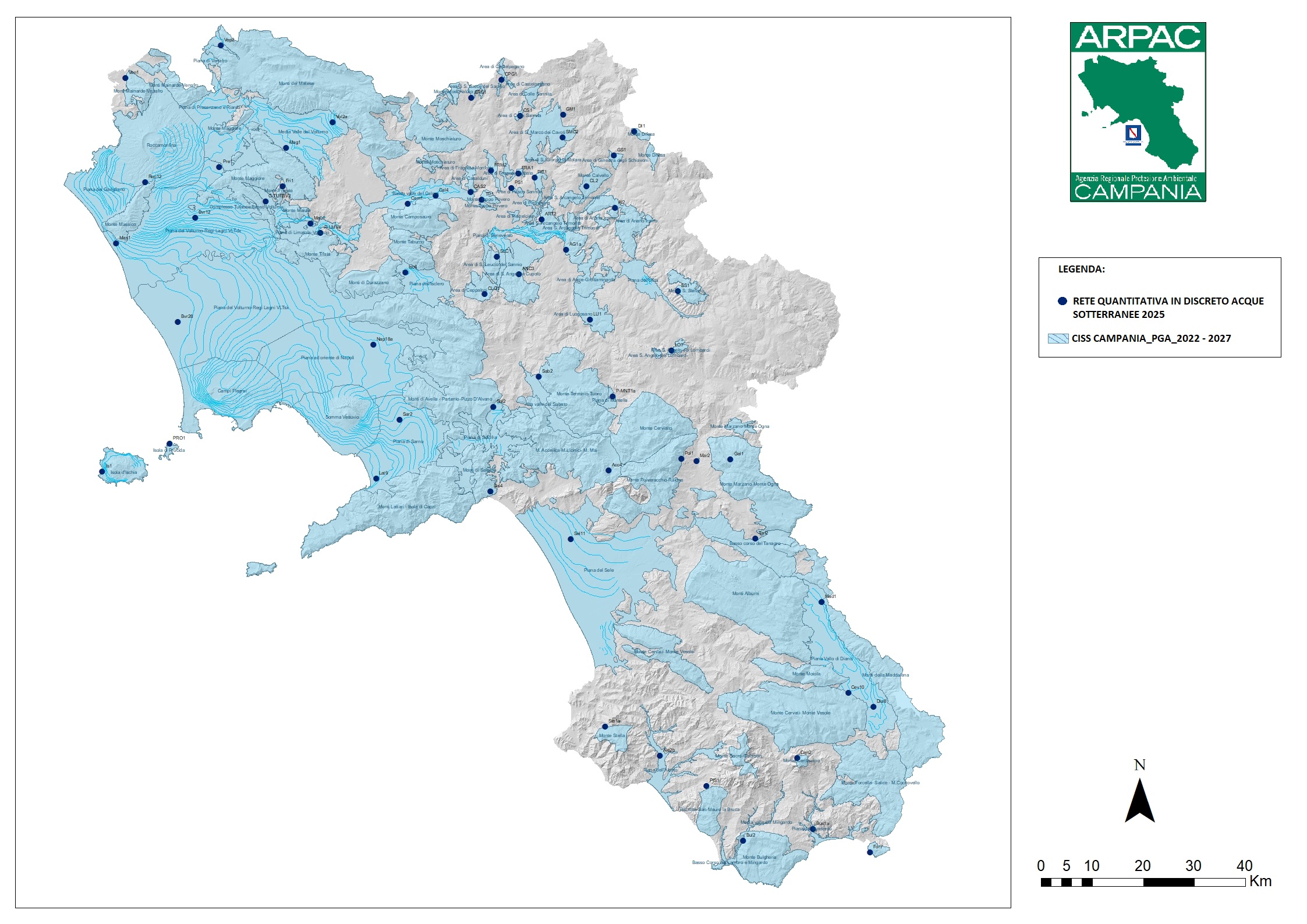 Nel 2002 il monitoraggio riguardava 40 corpi idrici sotterranei principali, successivamente ampliati a 49 corpi idrici “significativi”, come individuati dal Piano di Tutela delle Acque della Regione Campania (PTA) adottato nel 2007, in attuazione dell’art. 121 del D.Lgs. 152/2006. In corrispondenza di ciascun corpo idrico sotterraneo, ARPAC ha individuato siti di campionamento (stazioni di monitoraggio) rappresentativi — pozzi e sorgenti perenni — rispondenti ai requisiti previsti per le reti di monitoraggio chimico dall’Allegato 3 alla Parte Terza del D.Lgs. 152/2006.