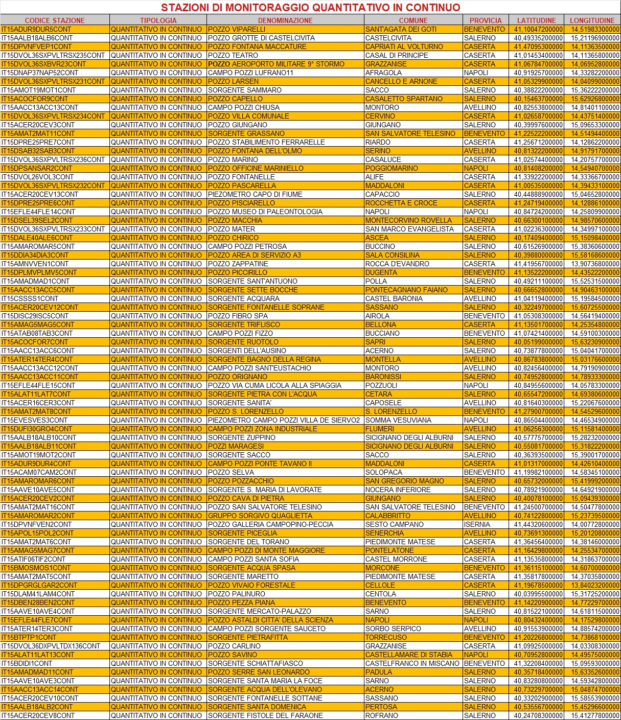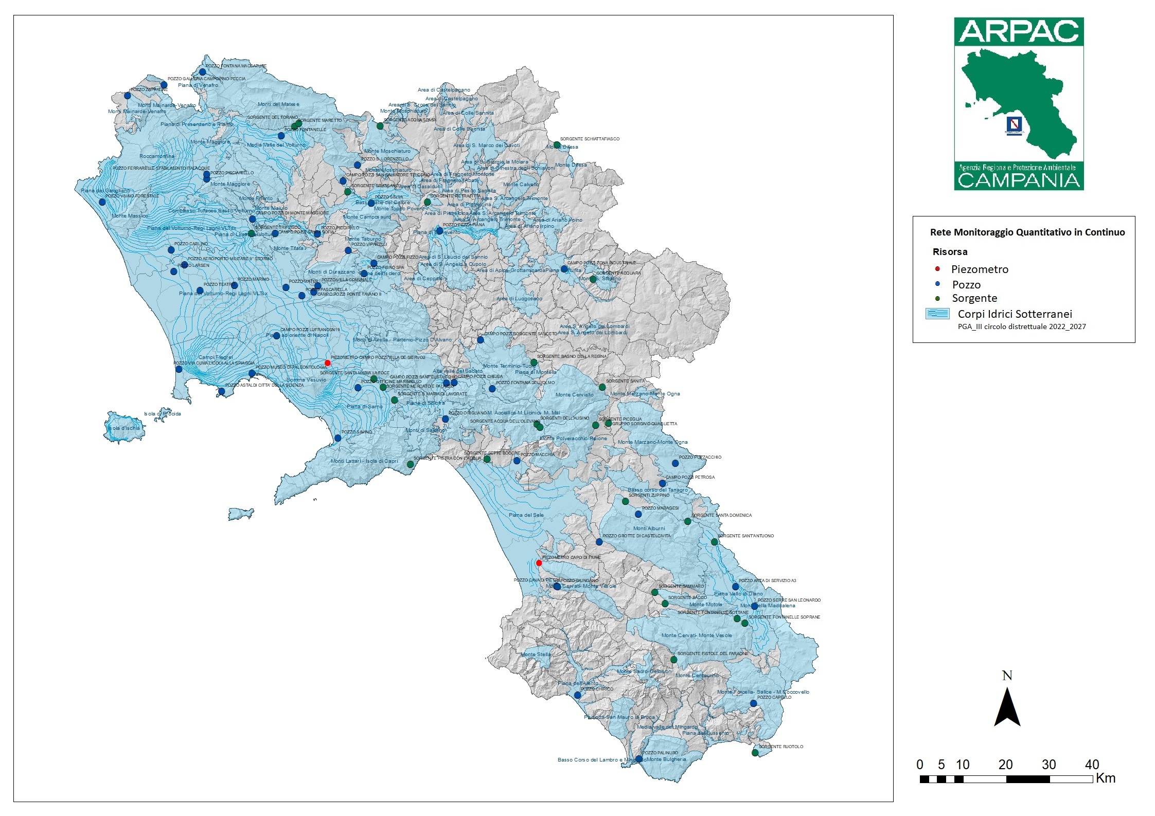 A partire dal biennio 2007-2008 ARPAC ha attivato, alla scala regionale, una rete di monitoraggio delle acque sotterranee finalizzata alla rilevazione dello stato quantitativo in continuo dei corpi idrici sotterranei. In principio la rete era costituita da 40 stazioni fisse con sonde multiparametriche, per un totale di 180 sensori di parametri qualitativi e quantitativi delle acque di falda e sorgive, i cui siti significativi alla scala regionale sono stati individuati nel 2007 dal Piano di Tutela delle Acque della Regione Campania (PTA).
