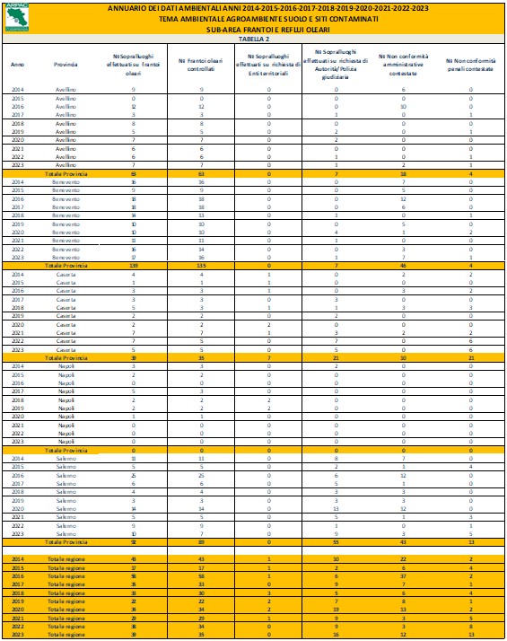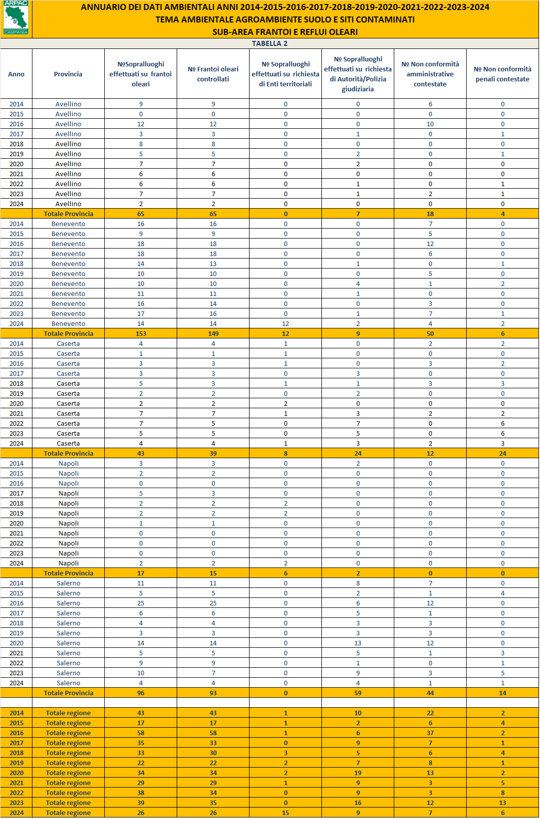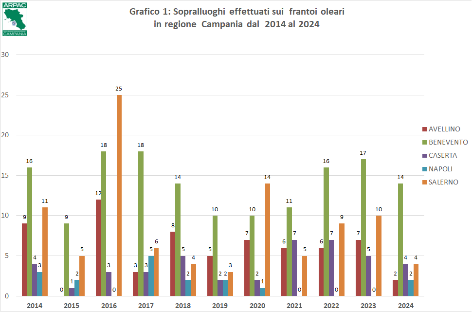 Le attività di controllo, effettuate dall’Agenzia sui frantoi, sono sintetizzate nelle seguenti tre tabelle descrittive. Nella tabella 1 sono indicati il numero di frantoi oleari censiti per ogni provincia (fonte dati Portale dell’Olio d’oliva del Sistema Informativo Agricolo Nazionale, SIAN anno 2024) e il numero di controlli annuali mediamente effettuati. Essi comprendono anche quelli che l’ARPAC, eventualmente, effettua su richiesta di Enti Territoriali o dell’Autorità Giudiziaria per specifiche criticità che possono rendere necessaria anche l’esecuzione di campionamenti e successive analisi di acque superficiali, per verificarne l’eventuale stato di inquinamento