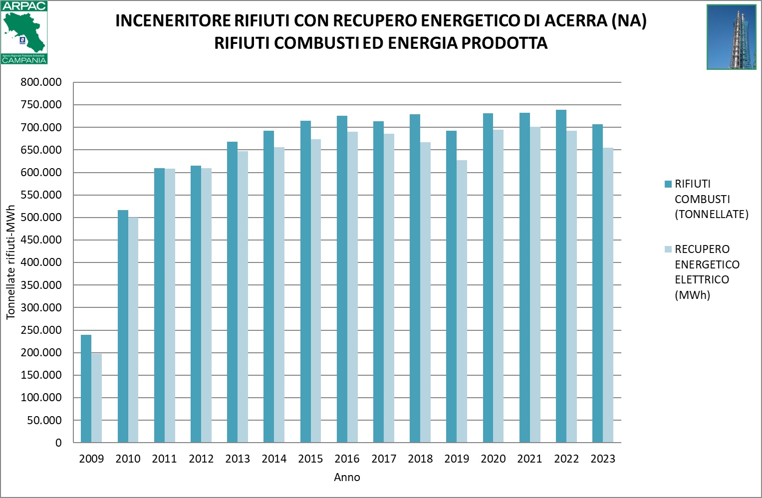 Presso l’Inceneritore di Acerra a partire dal 2009 e fino al 2023 (ultimo dato disponibile periodicamente oggetto di aggiornamento), dall’analisi dei dati disponibili, forniti dalla Sezione Regionale del Catasto Rifiuti dell’ARPAC, sulla base dell’analisi dei dati provenienti sia dai Modelli Unici di Dichiarazione (MUD) sia dall’Osservatorio Rifiuti SOvraregionale (ORSO), si evince come, in circa 14 anni di attività l’impianto ha bruciato 9.827.192 tonnellate di rifiuti, producendo oltre 9 milioni di MW/h di energia elettrica. Questo è avvenuto con un rapporto tra energia prodotta (MWh) e rifiuti combusti (Tonnellate) quasi costantemente superiore a 0,90 (con una media di 0,95) e molto prossimo all’unità in termini di recupero energetico. A titolo semplificativo basti pensare che per produrre 1 Kw/h di energia elettrica è stato necessario bruciare mediamente circa 1 Kg di rifiuti. Di seguito nei grafici n.1 e n.2 sono evidenziati chiaramente tali dati.