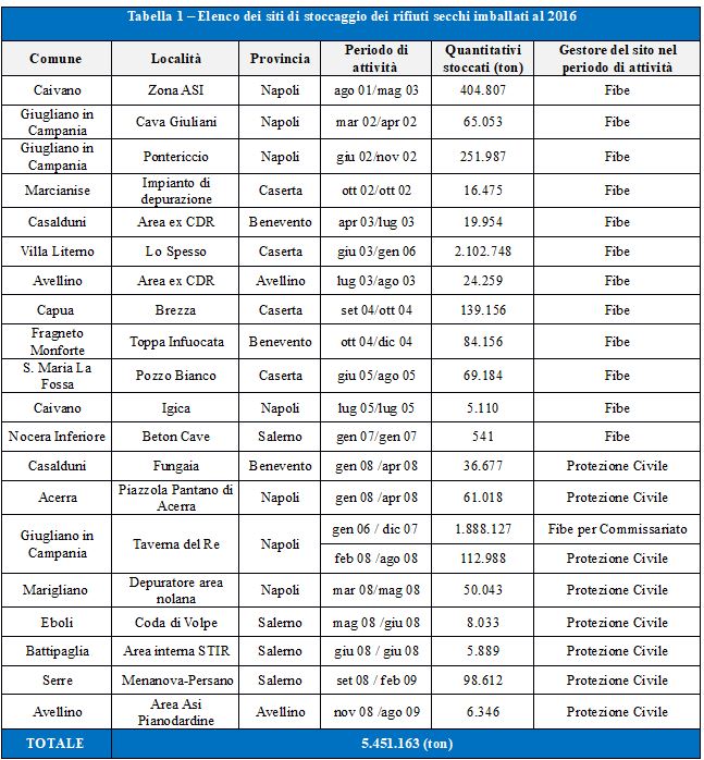 Il Governo italiano, con D.L. n. 185 del 25.11.2015, convertito in Legge con modificazione, n. 9 del 22 gennaio 2016, ha stabilito, ai sensi dell’art. 2 del citato Decreto legge, che il Presidente della Regione Campania dovesse predisporre un piano straordinario di interventi finalizzato, tra le altre cose “…allo smaltimento, ove occorra anche attraverso la messa in sicurezza permanente in situ, dei rifiuti in deposito nei diversi siti della Regione Campania risalenti al periodo emergenziale 2000/2009 e comunque non oltre il 31 dicembre 2009…”. La Regione Campania per attuare quanto previsto dal DL del Governo italiano, attraverso Delibere di Giunta (DGR n. 609 del 26/11/2015 e DGR n. 828 del 23/12/2015), ha adottato un piano stralcio operativo di interventi di rimozione, trasporto e smaltimento in ambito comunitario e/o recupero in ambito nazionale o comunitario di rifiuti imballati e stoccati presso otto siti ricompresi nei territori delle 5 province della regione, per un totale di circa 800.000 tonnellate e con successivo decreto, n. 115 del 24/12/2015, sono stati approvati gli atti di gara per la realizzazione del piano stralcio di cui all’art. 2 del citato Decreto Legge. I siti oggetto delle attività di cui al piano stralcio precedente sono riportati nella successiva tabella 2