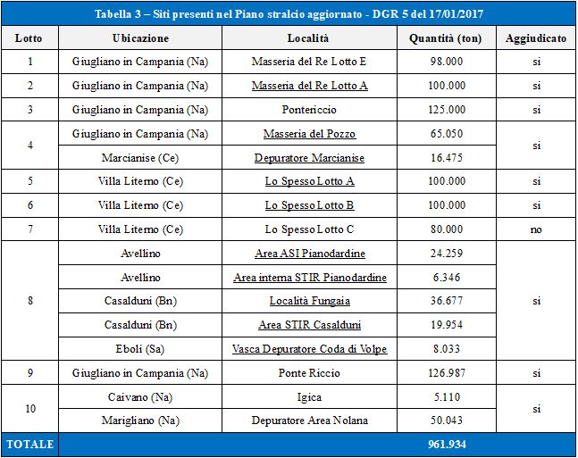 Degli otto lotti messi a gara sono stati aggiudicati (Decreto n. 39 del 15/04/2016) il 2, il 4, il 5, il 6 e l’8 riportati nella tabella 2, per un totale di circa 480.000 tonnellate di rifiuti da rimuovere. Il bando di gara indetto per gli interventi di rimozione, trasporto e smaltimento dei rifiuti stoccati ha previsto la caratterizzazione analitica degli stessi rifiuti da parte delle ditte aggiudicatarie e la Regione Campania – ai sensi dell’art. 5 del Capitolato Speciale di Appalto del bando di gara – ha stabilito di effettuare, attraverso ARPA Campania, attività di controllo durante lo svolgimento delle operazioni di campionamento in campo, nonché di caratterizzazione analitica, verificando la corretta applicazione delle metodiche di campionamento e validando i risultati analitici, sul 20% dei campioni esaminati. Con successiva DGR n. 5 del 10 gennaio 2017, la Regione Campania ha aggiornato il piano stralcio operativo di cui alla DGR n. 609 del 26/11/2015 e DGR n. 828 del 23/12/2015, così come riportato nella successiva tabella 3