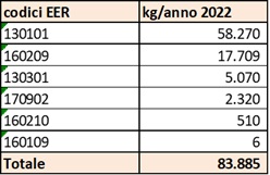 Per quanto riguarda la tipologia dei rifiuti, il codice EER più rappresentato è 130101 (58.270 kg), seguito da 160209 (17.709 kg) e 130301 (5.070 kg).