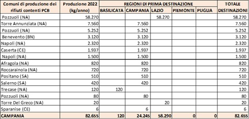Nel 2022, in Campania sono stati prodotti 83.885 kg di rifiuti contenenti PCB, con la produzione concentrata prevalentemente nella provincia di Napoli (77.892 kg), seguita da Benevento (3.120 kg), Caserta (1.943 kg) e Salerno (930 kg). Una quota significativa della produzione è riconducibile a una ditta con sede a Pozzuoli, che ha generato 58.270 kg di rifiuti contenenti PCB, successivamente inviati nel Lazio per il trattamento.