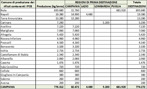 L'analisi territoriale individua diversi Comuni di produzione, tra cui Napoli, Pozzuoli, Torre Annunziata e Benevento. La destinazione principale per il trattamento dei rifiuti contenenti PCB è il Lazio (58.290 kg), con quantità minori gestite in Campania (24.245 kg) e Basilicata (120 kg).