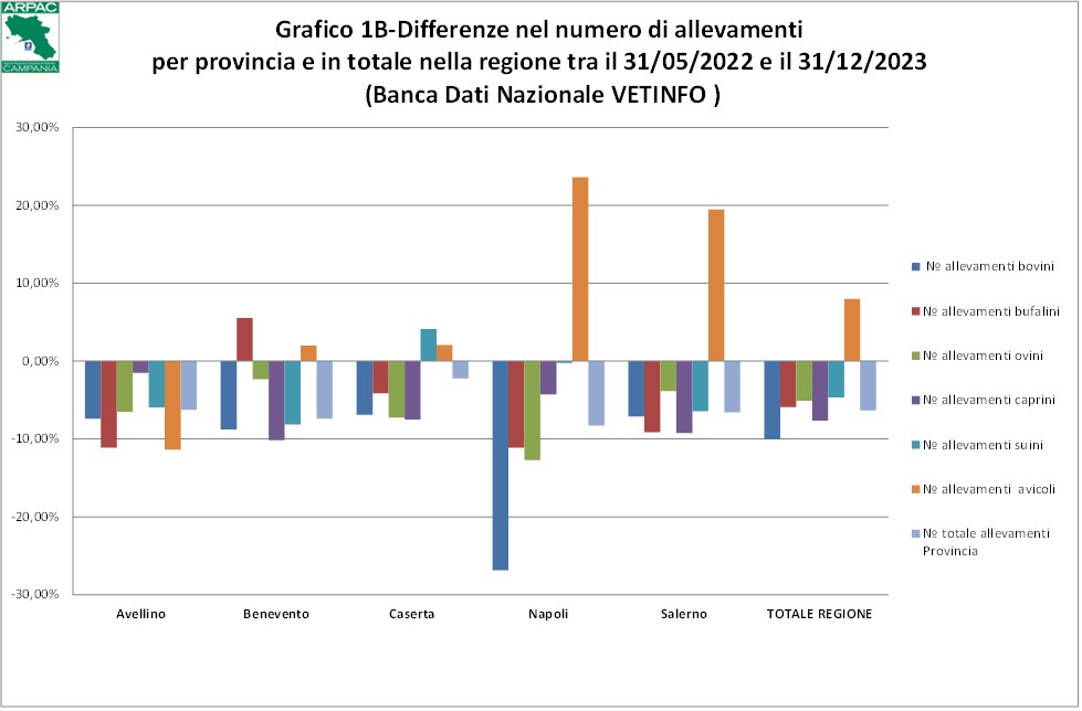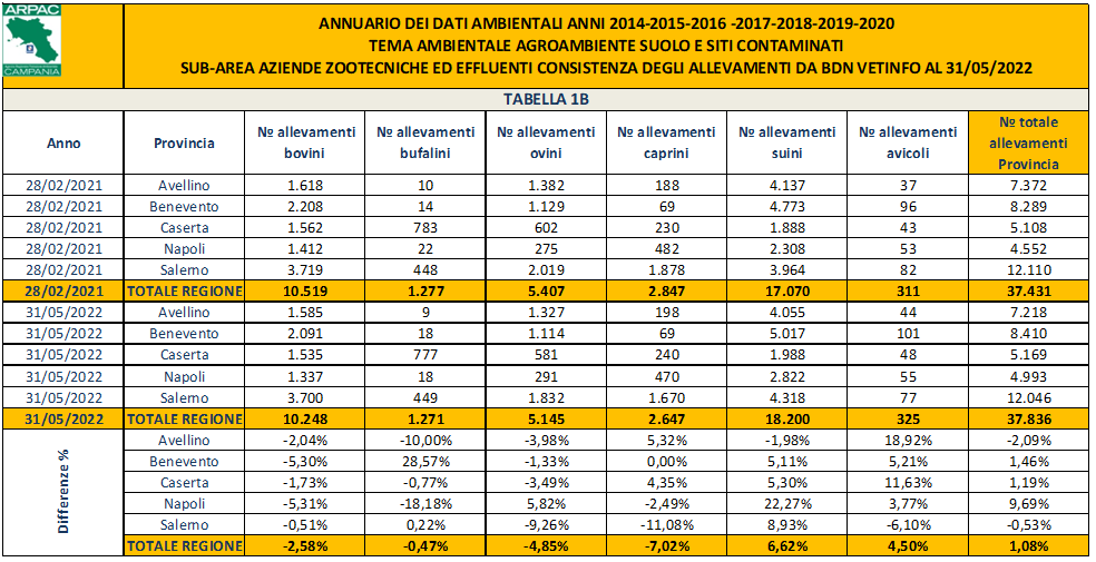 Nel ricco quadro nazionale la zootecnia campana si caratterizza per l'elevato numero di capi ed aziende bufaline, che si concentrano soprattutto nelle provincie di Caserta e Salerno , in aziende agricole spesso di tipo intensivo o in allevamenti "senza terra". Queste peculiarità e la conseguente forte concentrazione di animali in determinati comprensori fanno sì che, in regione Campania, la fertirrigazione attuata con reflui zootecnici, sia una pratica alquanto diffusa ma rischiosa per l'ambiente. Tenendo conto dei coefficienti di produzione riportati in letteratura, si stima (fonte Assessorato Agricoltura – gennaio 2013) che ogni anno si producono sul territorio regionale 3.795.530 m di liquami zootecnici che per la maggior parte sono utilizzate per fini agronomici. Nelle tabelle 1A ed 1B sottostanti, compilate con i dati estratti dalla Banca Dati Nazionale del settore veterinario aggiornati al 31/12/2023, si evince chiaramente quali siano state le variazioni, sia in termini di numero di capi allevati sia in termini di aziende di allevamento, dal mese di Maggio 2022 al mese di Dicembre 2023. Questa analisi (con i relativi andamenti) risulta ancora più chiara dai successivi grafici 1A ed 1B
